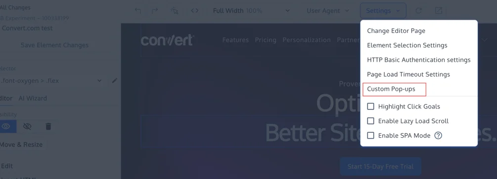 Custom pop-ups allow you to A/B test pop-ups directly in the Convert Visual Editor.