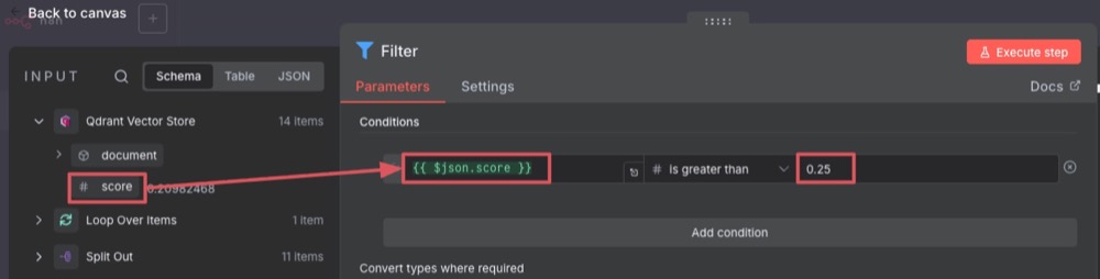 For each of these themes, the Qdrant node fetches 14 documents, each with a similarity score. These 14 documents are fed into Filter. And in the filter, we decide how we want to decide what to keep. So drag the score over to the condition, and set a number that is greater than 0.25.
