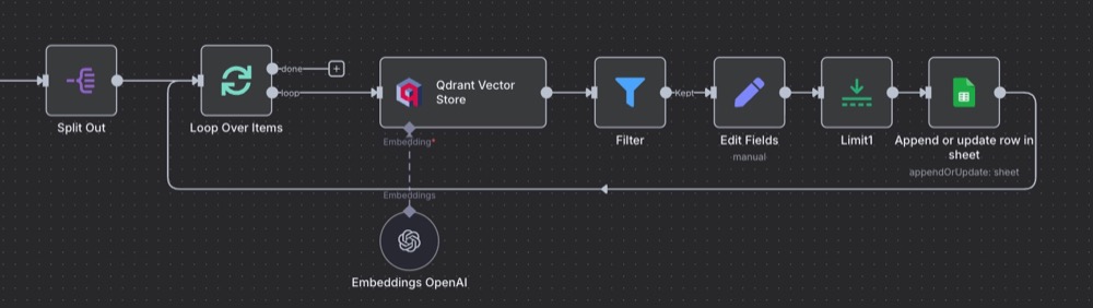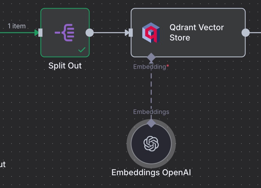 Now, you’ll see there is an issue when you run the workflow with these nodes. It’s to do with the nature of the Split Out node and the Qdrant node.