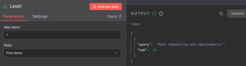 We want a new dataset that contains the name of the theme and the number of documents. Here’s how we do that. In the Edit Fields node, create a new String field, call it “query” (though you can call it whatever you want), then drag the theme name from the Loop Over Items input.