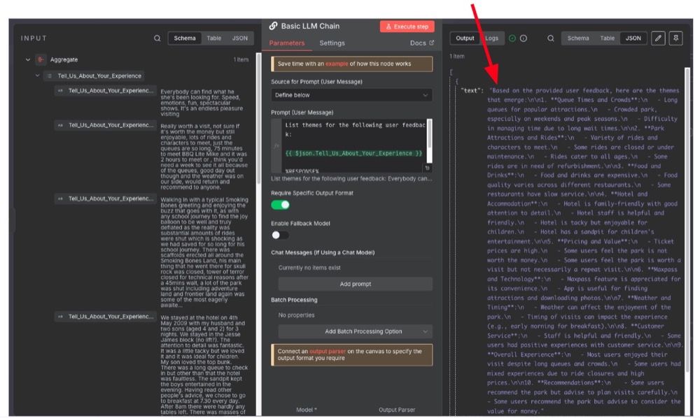 Now, when we run the workflow, we should have output in the structured format we’re after. It should also capture themes, using the provided themes as samples.