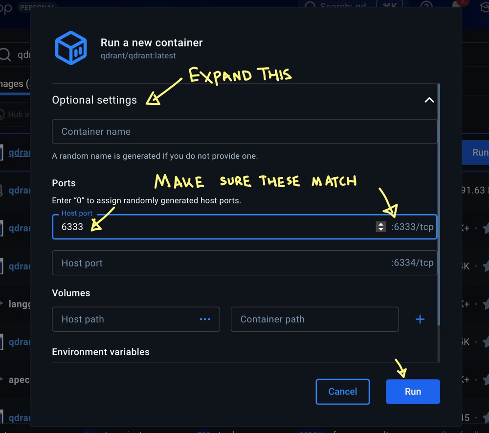 When you hit Run, in the pop-up, select “Optional settings” and make sure the port numbers match. You’ll need to copy the number from the right and paste it into the “host port” field. You can optionally give the container a name. Then hit Run again.