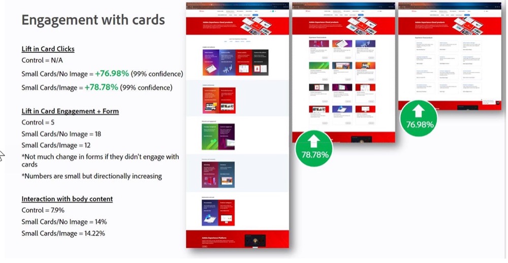 The goal was to get people to interact with the product content and go to the next page. The UX/UI team relished the idea of trying different UX patterns to compare with the default. They didn’t have to research and finally rest on just one idea. They had their own hypotheses and they put them to the test. The fun result was that both challengers were better than the control. Engagement for both designs was up dramatically as they found a way to move more of the content up on the page.
