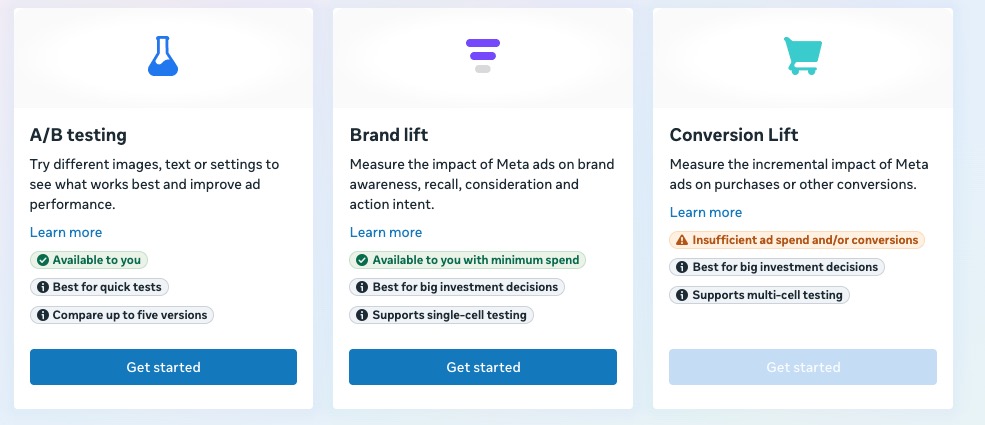 One of the key ways that Meta supports experimentation is through its built-in A/B testing feature, which allows you to run ads against one another in a controlled and more robust way. It is slower, but more reliable.