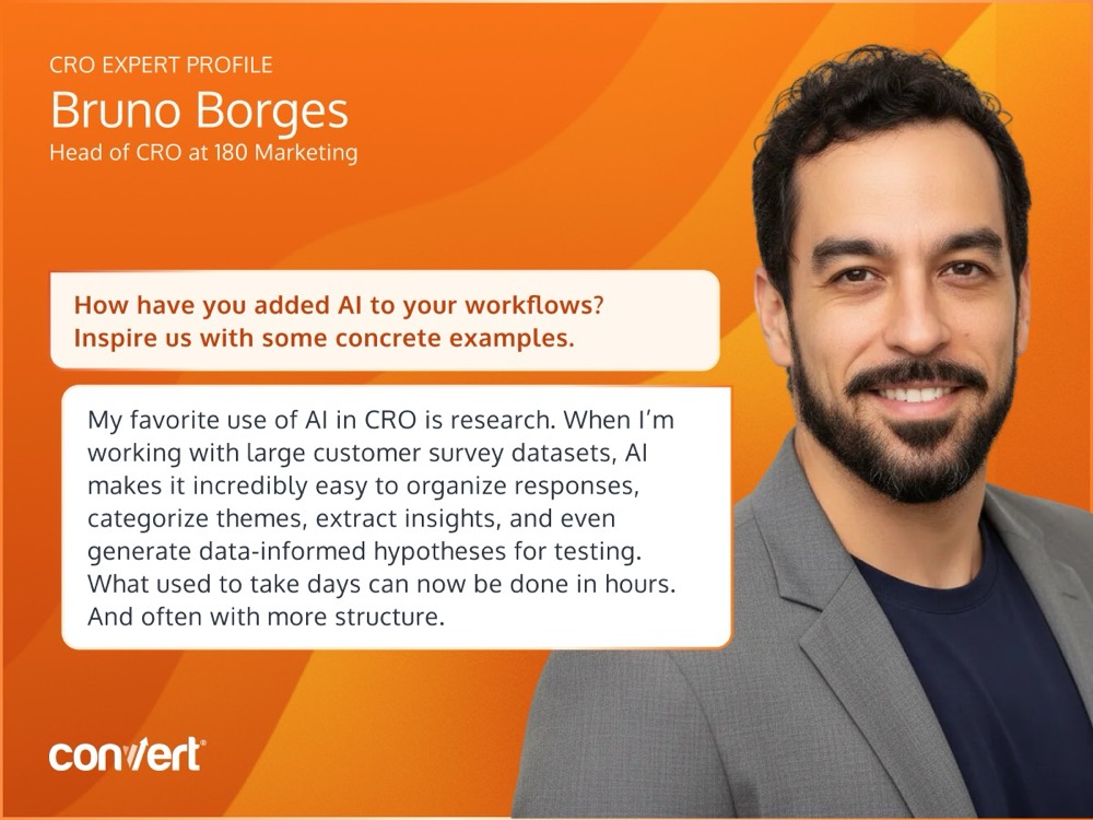 Beyond the repeated time savings, my favorite use of AI in CRO is research. When I’m working with large customer survey datasets, AI makes it incredibly easy to organize responses, categorize themes, extract insights, and even generate data-informed hypotheses for testing. What used to take days can now be done in hours. And often with more structure.